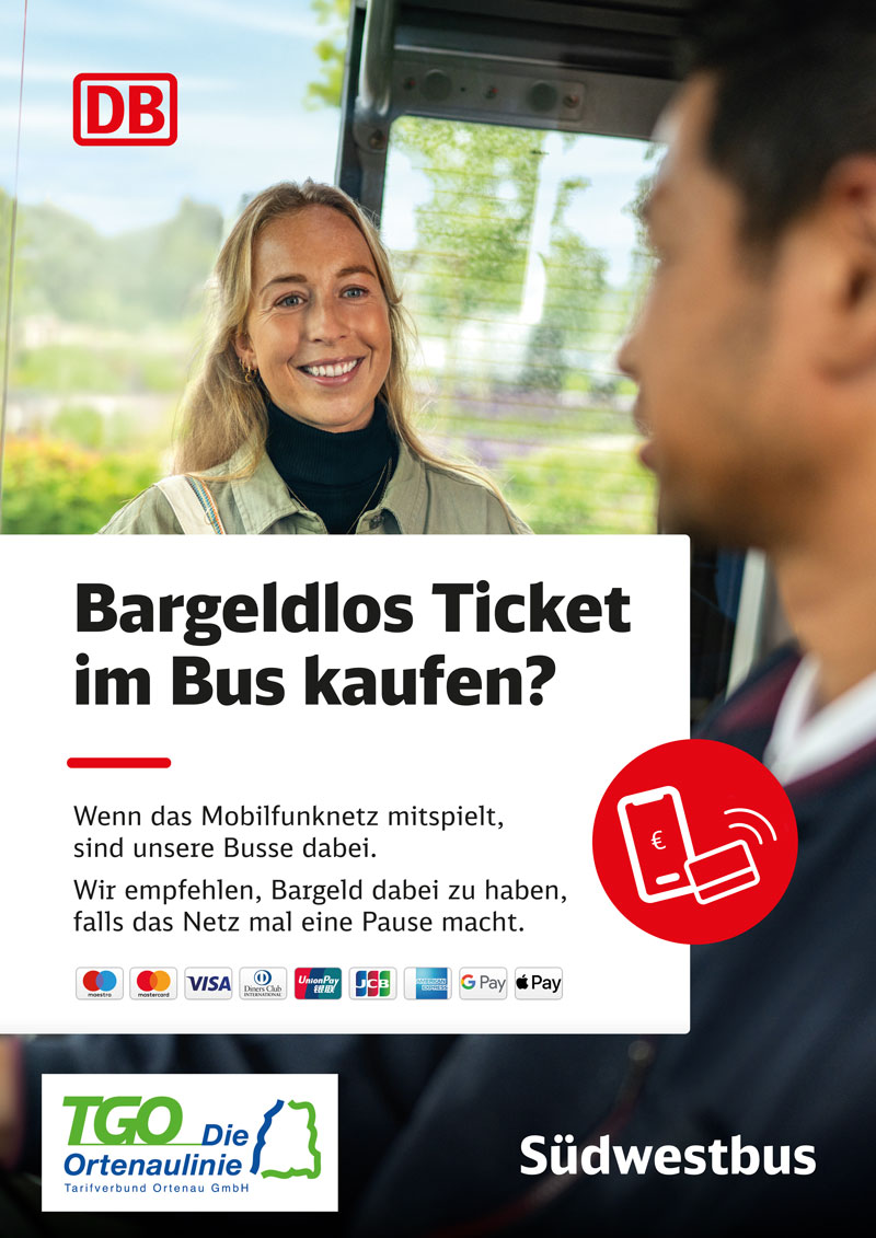 Ab dem 1. Mai 2026 wird der Ticketkauf in den Südwestbussen im gesamten TGO‑Verbundgebiet weiter modernisiert: Fahrgäste können Fahrscheine beim Fahrpersonal bargeldlos bezahlen – etwa per Karte oder anderem bargeldlosen Zahlungsmittel.